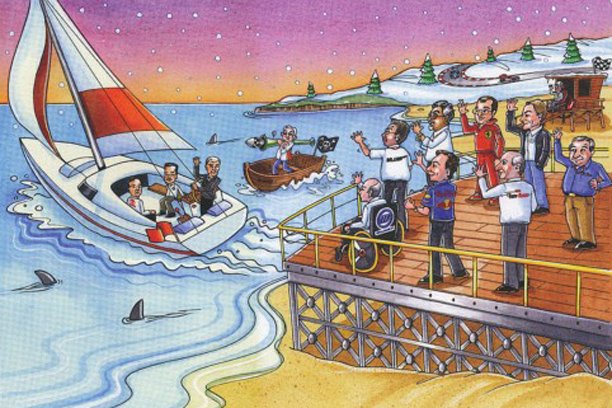 F1 autosacīkšu šefs Bērnijs Eklstons kārtējo reizi daudzus sasmīdinājis ar savu Ziemassvētku apsveikuma kartiņu. Šīgada kartiņā redzams līdzšinējais FIA prezidents Makss Moslijs, BMW Mario Teisens un Toyota Džons Hovets, kas ar burulaivu dodas pretī saulrietam, kamēr konkurējošo F1 komandu vadītāji stāv krastā un māj ardievas.