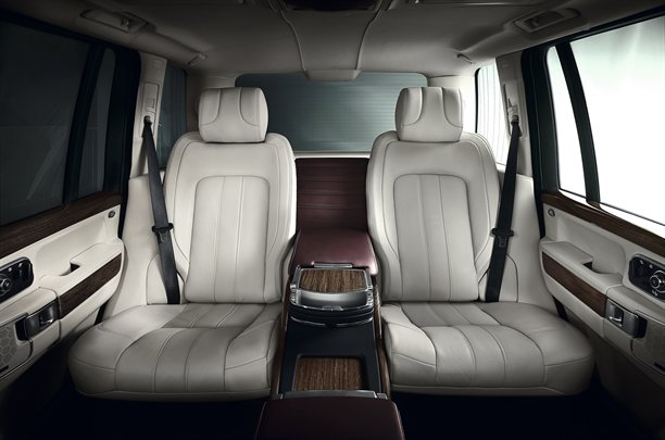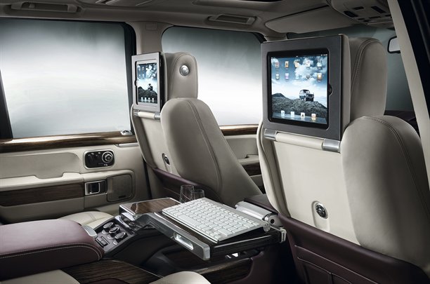 Range Rover dizaineri šai luksusa modifikācijai piedāvā atšķirīgu interjera risinājumu – divus individuālos aizmugures sēdekļus ar visuskonsoli, kurā atrodams ledusskapis un datora galdiņš. Priekšējo sēdekļu galvas balsti, savukārt, ir kā radīti Apple iPad ievietošanai.