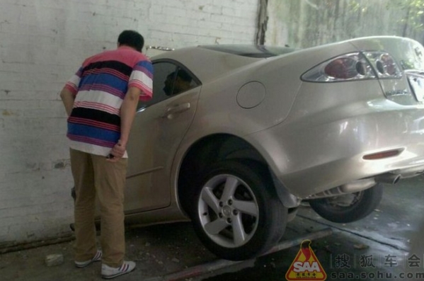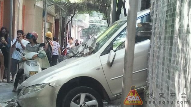 Sieviete ar Mazda6 iztriecas cauri sienai