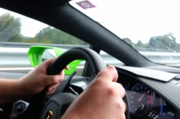 Ungārijas policija laidusi klajā videoierakstu, kas uzņemts no lielā ātrumā braucoša Lamborghini Huracan salona.
