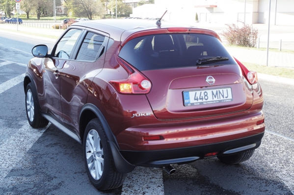 Tāpēc Juke ir augsts klīrenss, un off-road parauga apdares elementi, savukārt jumta līnija ir slīpa un aizmugures durvju rokturi veiksmīgi paslēpti jumta balstā, ļaujot profilā vizuāli ieraudzīt kupeju, nevis četrdurvju hečbeku.